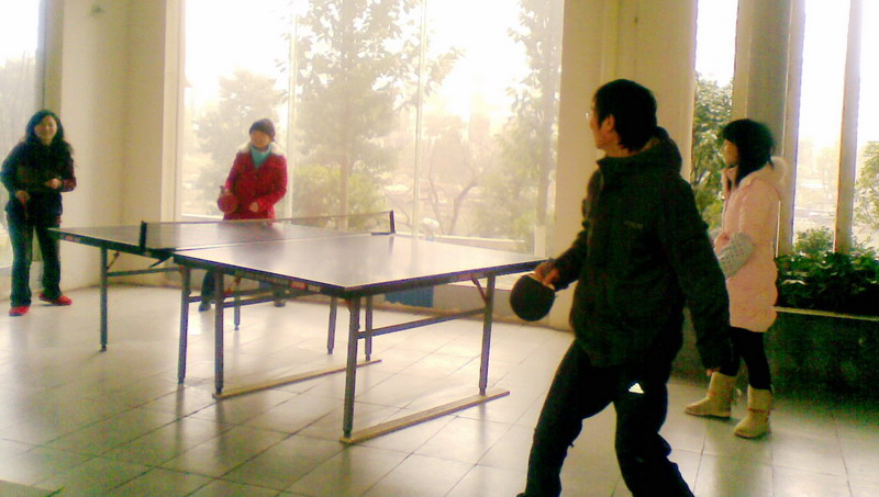 We are hot on playing table tennis in our noonday rest.There are 4 people in double, this requires speed, agility and good coordination.